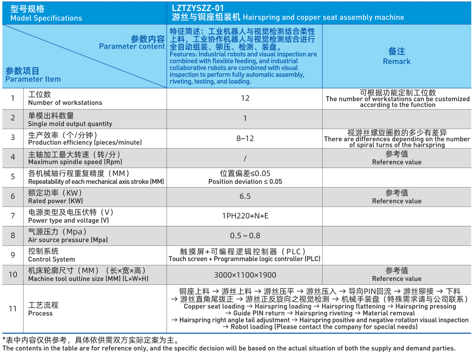 銅座上料 → 游絲上料 → 游絲壓平 → 游絲壓入 → 導向PIN回流 → 游絲鉚接 → 下料 → 游絲直角尾撥正 →游絲正反旋向之視覺檢測 →機械手裝盤(特殊需求請與公司聯(lián)系)工業(yè)機器人與視覺檢測結合柔性上料,工業(yè)協(xié)作機器人與視覺檢測結合進行全自動組裝、鉚壓、檢測、裝盤。